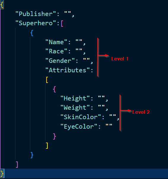 To obtain the JSON file in the following format. There are 2 nested levels that I want to generate. Level 1 with Name, Race, Gender (Under Superhero), Level 2 with Height, Weight, SkinColor, EyeColor (Under Attributes)-